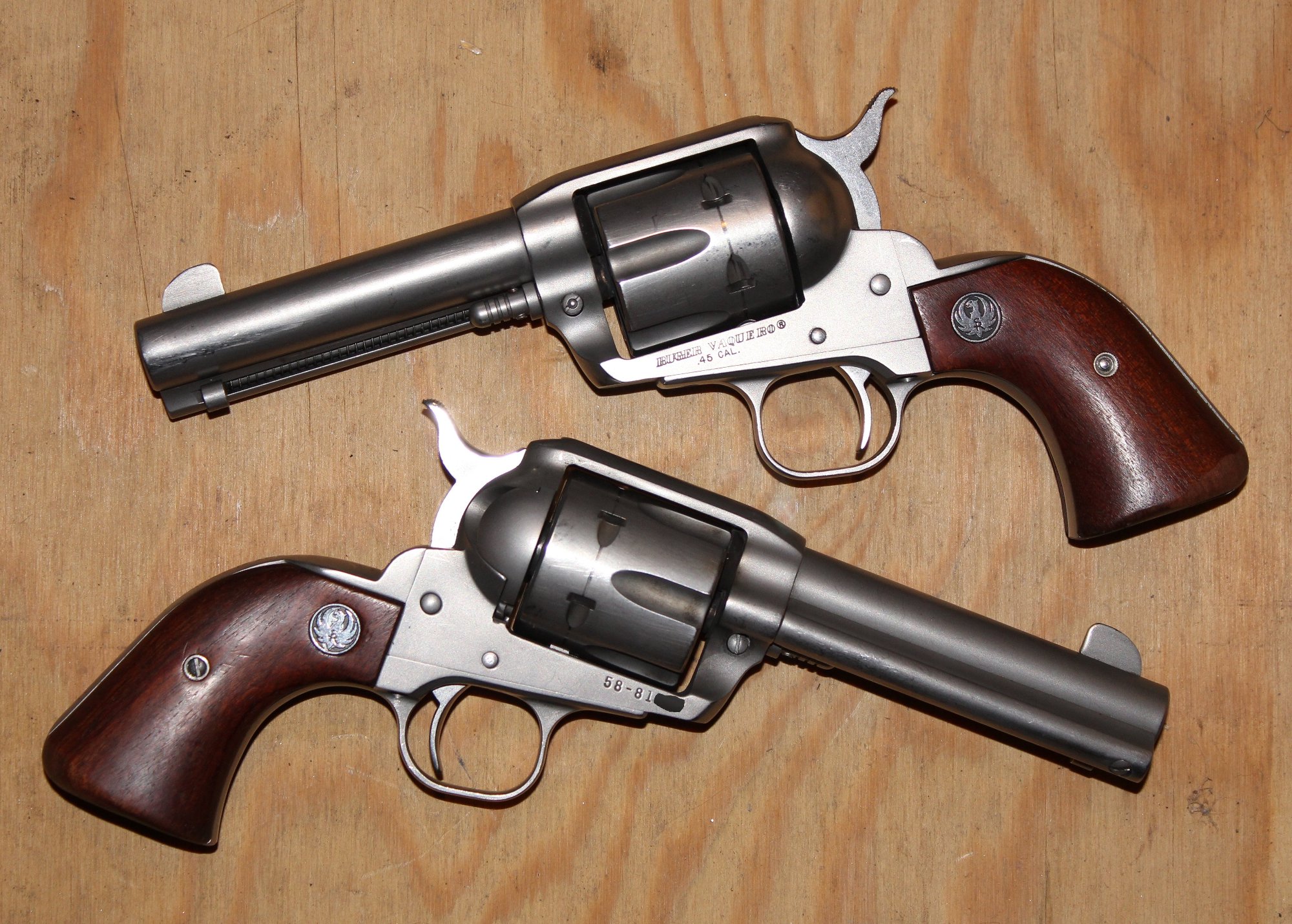 Ruger Vaquero revolvers, original style matched pair, 45 Colt, 4.6" barrels, bead-blasted stainless steel, free-spin pawls, tuned triggers, rounded butts, engraved backstraps, sold as a pair only: $1,200 PHOTO