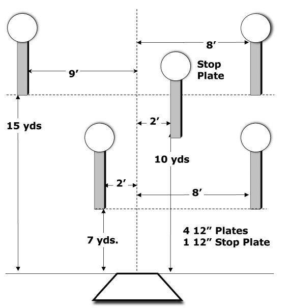 Stage procedure: Upon start signal, from Box A engage the target plates in any order, then engage the stop plate.